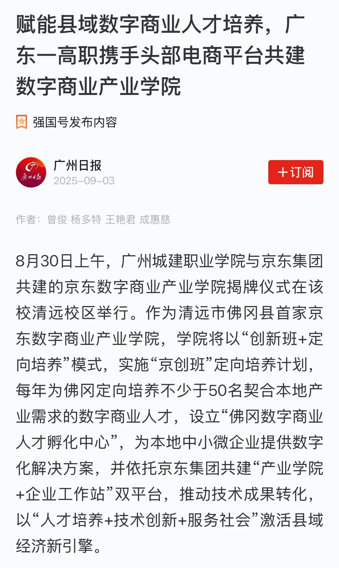 8月30日上午,廣州城建職業(yè)學(xué)院與京東集團共建的京東數(shù)字商業(yè)產(chǎn)業(yè)學(xué)院揭牌儀式在該校清遠校區(qū)舉行。作為清遠市佛岡縣首家京東數(shù)字商業(yè)產(chǎn)業(yè)學(xué)院,學(xué)院將以“創(chuàng)新班+定向培養(yǎng)”模式,實施“京創(chuàng)班”定向培養(yǎng)計劃,每年為佛岡定向培養(yǎng)不少于50名契合本地產(chǎn)業(yè)需求的數(shù)字商業(yè)人才,設(shè)立“佛岡數(shù)字商業(yè)人才孵化中心”,為本地中小微企業(yè)提供數(shù)字化解決方案,并依托京東集團共建“產(chǎn)業(yè)學(xué)院+企業(yè)工作站”雙平臺,推動技術(shù)成果轉(zhuǎn)化,以“人才培養(yǎng)+技術(shù)創(chuàng)新+服務(wù)社會”激活縣域經(jīng)濟新引擎。