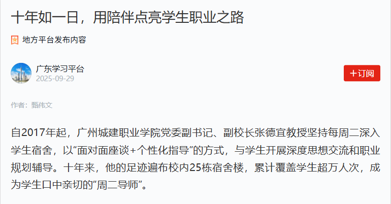 自2017年起,廣州城建職業(yè)學(xué)院黨委副書記、副校長張德宜教授堅持每周二深入學(xué)生宿舍,以“面對面座談+個性化指導(dǎo)”的方式,與學(xué)生開展深度思想交流和職業(yè)規(guī)劃輔導(dǎo)。十年來,他的足跡遍布校內(nèi)25棟宿舍樓,累計覆蓋學(xué)生超萬人次,成為學(xué)生口中親切的“周二導(dǎo)師”。