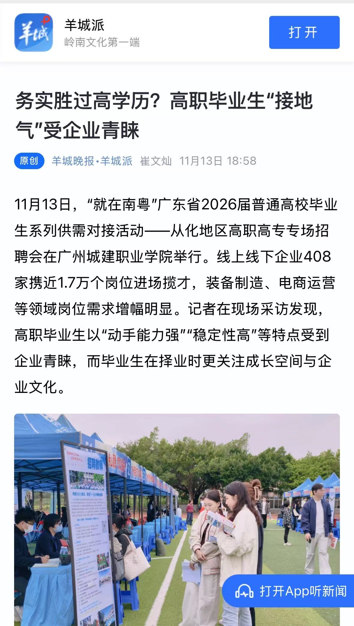 11月13日,“就在南粵”廣東省2026屆普通高校畢業(yè)生系列供需對接活動——從化地區(qū)高職高專專場招聘會在廣州城建職業(yè)學(xué)院舉行。線上線下企業(yè)408家攜近1.7萬個崗位進(jìn)場攬才,裝備制造、電商運(yùn)營等領(lǐng)域崗位需求增幅明顯。記者在現(xiàn)場采訪發(fā)現(xiàn),高職畢業(yè)生以“動手能力強(qiáng)”“穩(wěn)定性高”等特點(diǎn)受到企業(yè)青睞,而畢業(yè)生在擇業(yè)時更關(guān)注成長空間與企業(yè)文化。