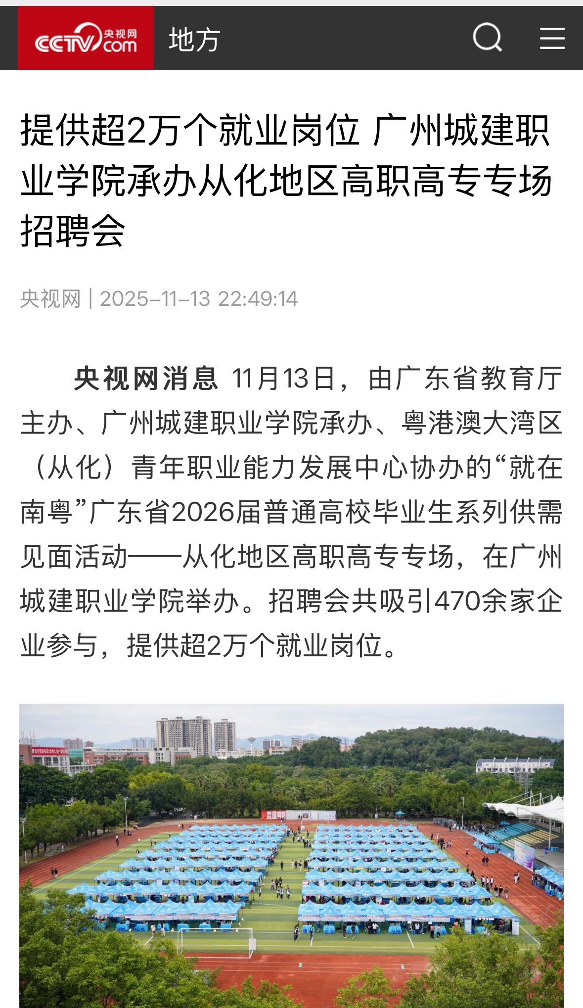 11月13日,由廣東省教育廳主辦、廣州城建職業(yè)學(xué)院承辦、粵港澳大灣區(qū)(從化)青年職業(yè)能力發(fā)展中心協(xié)辦的“就在南粵”廣東省2026屆普通高校畢業(yè)生系列供需見面活動——從化地區(qū)高職高專專場,在廣州城建職業(yè)學(xué)院舉辦。招聘會共吸引470余家企業(yè)參與,提供超2萬個就業(yè)崗位。
