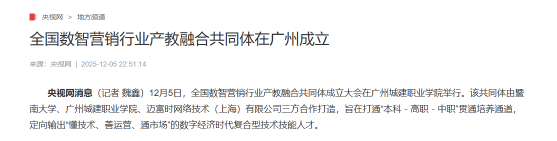 央視網(wǎng)消息(記者 魏鑫)12月5日,全國數(shù)智營銷行業(yè)產教融合共同體成立大會在廣州城建職業(yè)學院舉行。該共同體由暨南大學、廣州城建職業(yè)學院、邁富時網(wǎng)絡技術(上海)有限公司三方合作打造,旨在打通“本科-高職-中職”貫通培養(yǎng)通道,定向輸出“懂技術、善運營、通市場”的數(shù)字經(jīng)濟時代復合型技術技能人才。