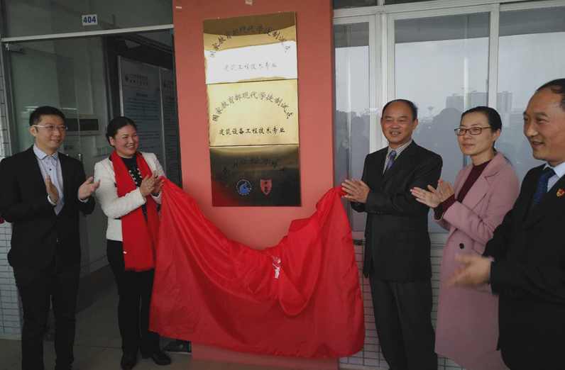 1月4日,學校舉行建筑產業(yè)園揭牌儀式,校長劉國生,副校長楊清國、周暉、王媚莎及廣東城建職教集團理事會常務理事單位代表,建筑工程學院領導班子、教研室主任代表參加了活動。劉校長、中建二局廣州分公司羅資奇總經理為建筑產業(yè)園揭牌,周副校長、華建消防公司李瑞吟副總經理、中辰鋼結構公司鄭平珍副總經理為我校建筑工程技術、建筑設備工程技術國家級現(xiàn)代學徒制試點專業(yè)揭牌。