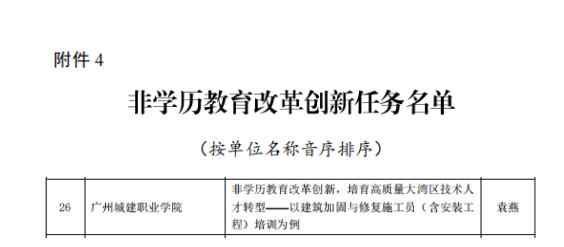 在高等繼續(xù)教育領(lǐng)域,全國申報了956項任務。經(jīng)教育部專家評議,有23個終身學習制度建設(shè)任務、61個學歷繼續(xù)教育教學改革創(chuàng)新任務、32個自學考試改革創(chuàng)新任務、103個非學歷教育改革創(chuàng)新任務、50個三教統(tǒng)籌協(xié)同創(chuàng)新任務入圍培育建設(shè)名單。我校憑借在服務區(qū)域?qū)W習型社會建設(shè)、推動職業(yè)教育、高等教育與繼續(xù)教育融合發(fā)展方面的創(chuàng)新實踐與顯著成效,入選非學歷教育改革創(chuàng)新任務。該項目依托省級工程造價高水平專業(yè)群和東方雨虹產(chǎn)業(yè)學院,針對大灣區(qū)企業(yè)職工、再就業(yè)人員和鄉(xiāng)村工匠等重點人群提供建筑加固與修復施工員(含安裝工程)專業(yè)技能培訓。重點圍繞立德樹人融入非學歷教育全過程、服務國家戰(zhàn)略和區(qū)域(行業(yè))發(fā)展開展培訓工作,推動企業(yè)職工、再就業(yè)人員和鄉(xiāng)村工匠等重點人群轉(zhuǎn)型升級。