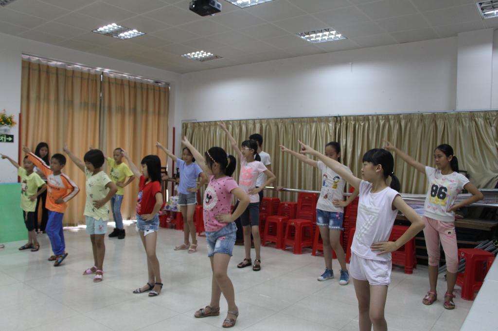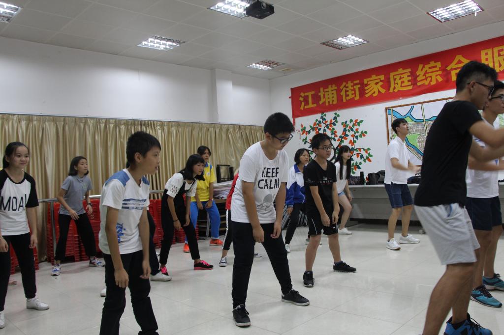 活動(dòng)期間,義工們分為兩個(gè)小組,一組為兒童隊(duì),帶領(lǐng)三到六年級(jí)的小朋友跳“小蘋(píng)果”舞蹈,另一組為青少年隊(duì),引導(dǎo)初中青少年以街舞為主要類(lèi)型的“鴉雀”舞蹈。在“快閃”活動(dòng)出演之前,我們快閃隊(duì)伍的成員們每天早上9:00準(zhǔn)時(shí)到江埔街家庭綜合服務(wù)中心對(duì)小朋友們進(jìn)行舞蹈培訓(xùn)。為使快閃活動(dòng)順利進(jìn)行,活動(dòng)前期,我們每位成員利用課余時(shí)間認(rèn)真自學(xué)舞蹈動(dòng)作,為本次舞蹈培訓(xùn)工作做好充分準(zhǔn)備。