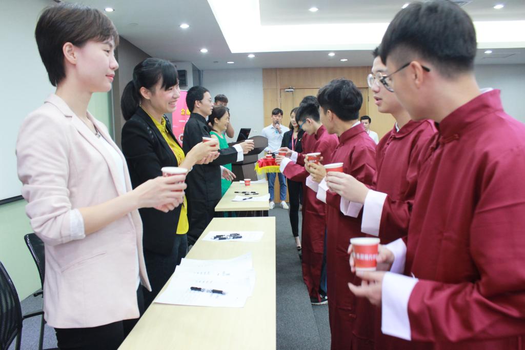 拜師會環(huán)節(jié),黃總與楊清國書記共同為校企雙方20位師父頒發(fā)了現(xiàn)代學(xué)徒制導(dǎo)師聘書。隨后36位學(xué)子身著馬褂,手捧清茶,正式開始了拜師儀式。在新時代的校企合作背景下,師徒結(jié)隊(duì)讓人們對他們的成長充滿期待。