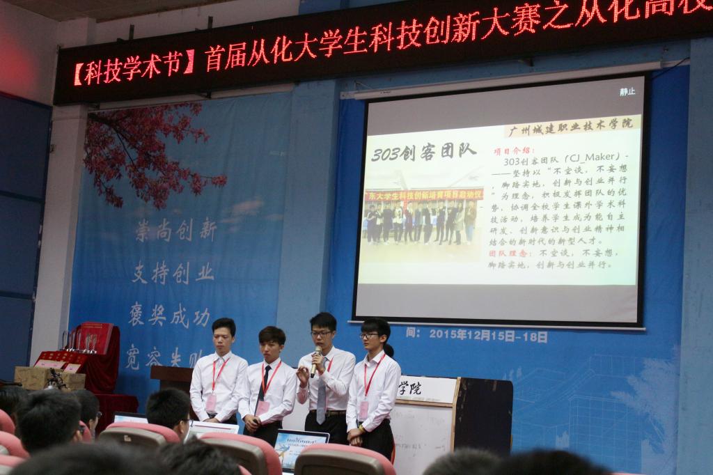 5月21日,由從化高校創(chuàng)新人才聯(lián)盟、廣州大學華軟軟件學院主辦的首屆從化大學生科技創(chuàng)新大賽之從化高校創(chuàng)新人才聯(lián)盟邀請賽在華軟學院禮堂一廳舉行。來自從化區(qū)8所高校隊伍參賽,共享創(chuàng)業(yè)經(jīng)驗,共話團隊發(fā)展。機電工程學院15機電一體化專業(yè)馬家俊等同學組成的創(chuàng)新實踐團隊——“創(chuàng)客工作室團隊”代表學校參加了此次大賽。