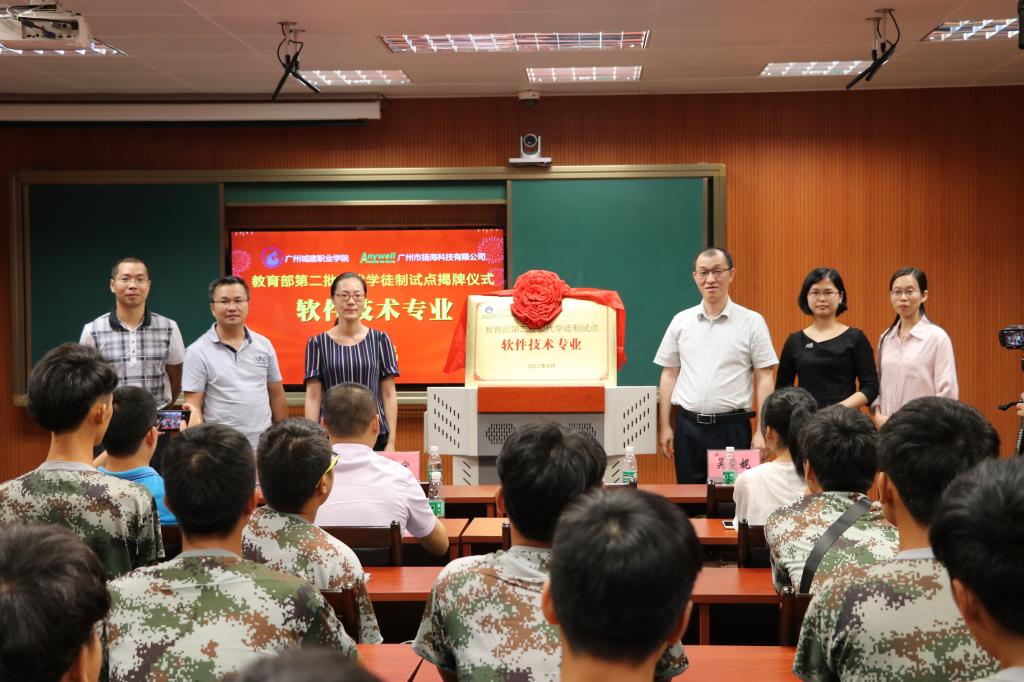 9月28日上午,學(xué)校攜手廣州揚(yáng)??萍加邢薰九e行教育部第二批現(xiàn)代學(xué)徒制試點揭牌儀式。公司總經(jīng)理凌遠(yuǎn)龍,總經(jīng)理助理吳曼妮、羅丹,產(chǎn)品中心總監(jiān)謝斗桂,技術(shù)事業(yè)部總監(jiān)何玲燕,學(xué)校副校長張德宜、周暉,信息工程學(xué)院全體院領(lǐng)導(dǎo),軟件技術(shù)專業(yè)教師和2017級軟件技術(shù)專業(yè)現(xiàn)代學(xué)徒制班全體學(xué)生參加儀式,儀式由信息工程學(xué)院院長曹春華主持。