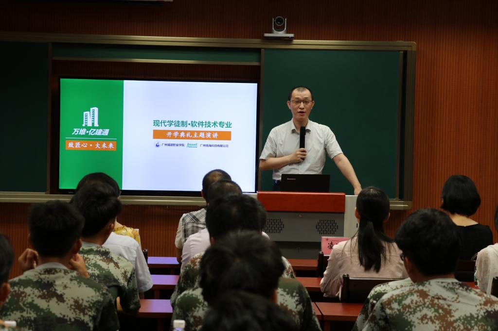 揭牌儀式前,凌遠(yuǎn)龍總經(jīng)理為35名現(xiàn)代學(xué)徒制學(xué)生進(jìn)行入學(xué)專業(yè)教育。凌總從企業(yè)的視角、導(dǎo)師的高度詮釋了現(xiàn)代學(xué)徒制的內(nèi)涵,結(jié)合行業(yè)應(yīng)用場景分析軟件技術(shù)專業(yè)的發(fā)展趨勢并重點介紹了技術(shù)、實施和銷售三個學(xué)徒崗位的任職要求與工作內(nèi)容,以自己的創(chuàng)業(yè)經(jīng)歷與感悟分享公司的價值觀、企業(yè)文化和創(chuàng)新氛圍,并勉勵學(xué)生用80%的時間磨礪專業(yè)技能,擁有一技之長,用20%的精力發(fā)展興趣特長,享受生活樂趣。凌總語言風(fēng)趣幽默,教學(xué)互動頻繁,課堂上掌聲與笑聲此起彼伏。
