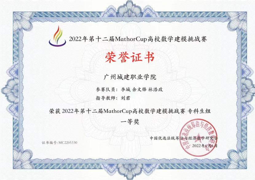 6月7日,2022年第十二屆MathorCup高校數(shù)學(xué)建模挑戰(zhàn)賽成績公布,經(jīng)過激烈角逐,由劉君老師指導(dǎo),李城、余文鋒、林浩政三位同學(xué)組成的參賽團(tuán)隊(duì)榮獲全國??平M一等獎(jiǎng),本次挑戰(zhàn)賽專科組全國一等獎(jiǎng)僅10項(xiàng)。