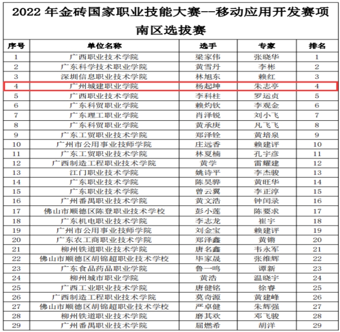 近日,由金磚國家職業(yè)技能大賽組委會主辦,金磚國家工商理事會技能發(fā)展工作組、廣西職業(yè)技術(shù)學院承辦的2022年金磚國家職業(yè)技能大賽“移動應用開發(fā)”賽項南區(qū)選拔賽成績揭曉,由信息工程學院朱志亭老師指導的楊起坤同學以第4名的成績獲得二等獎。