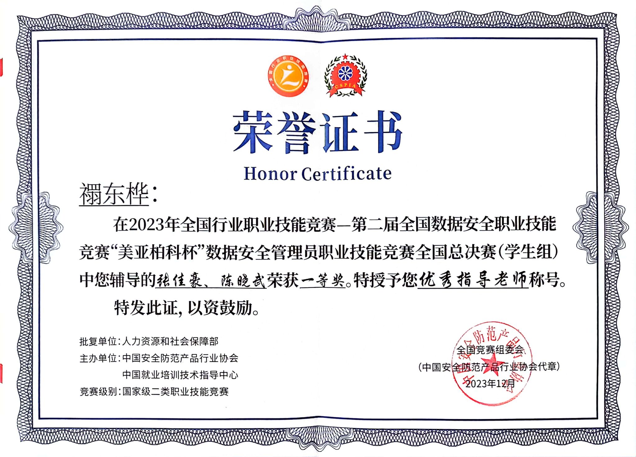 4月13日,我校收到2023年全國行業(yè)職業(yè)技能競賽—第二屆全國數(shù)據(jù)安全職業(yè)技能競賽組委會寄來的獲獎證書,我校信息工程學(xué)院計算機網(wǎng)絡(luò)技術(shù)專業(yè)學(xué)生張佳豪和陳曉武兩位同學(xué),分別以第2名和第7名的成績榮獲“數(shù)據(jù)安全管理員”賽項學(xué)生組一等獎;禤東樺老師獲“優(yōu)秀指導(dǎo)教師”稱號;學(xué)校獲“競賽優(yōu)勝院?!狈Q號。