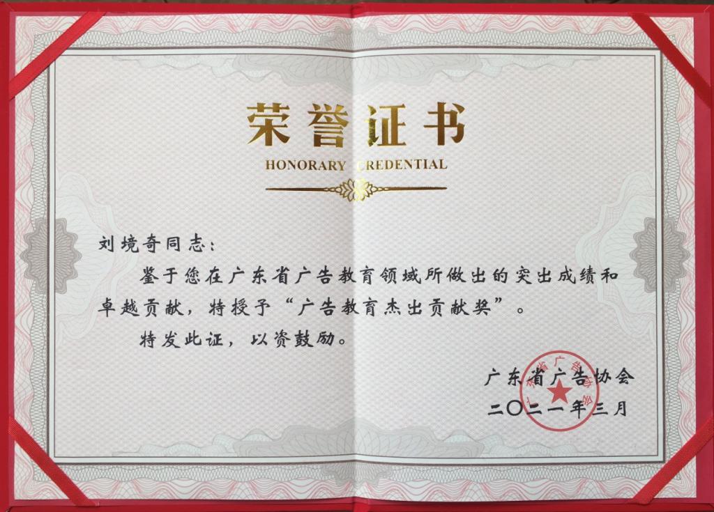 劉境奇教授在高職院校從教37年以來,致力于中國廣告設(shè)計教育研究與實踐,帶領(lǐng)師生在國內(nèi)及國際大賽中屢創(chuàng)佳績,為廣東廣告創(chuàng)意設(shè)計行業(yè)培養(yǎng)了大批優(yōu)秀人才。初心致遠,勇立潮頭,爭當育人模范,此次獲獎,也是廣東廣告與教育行業(yè)對劉境奇教授在國內(nèi)廣告教育發(fā)展做出的卓越貢獻的認可。
