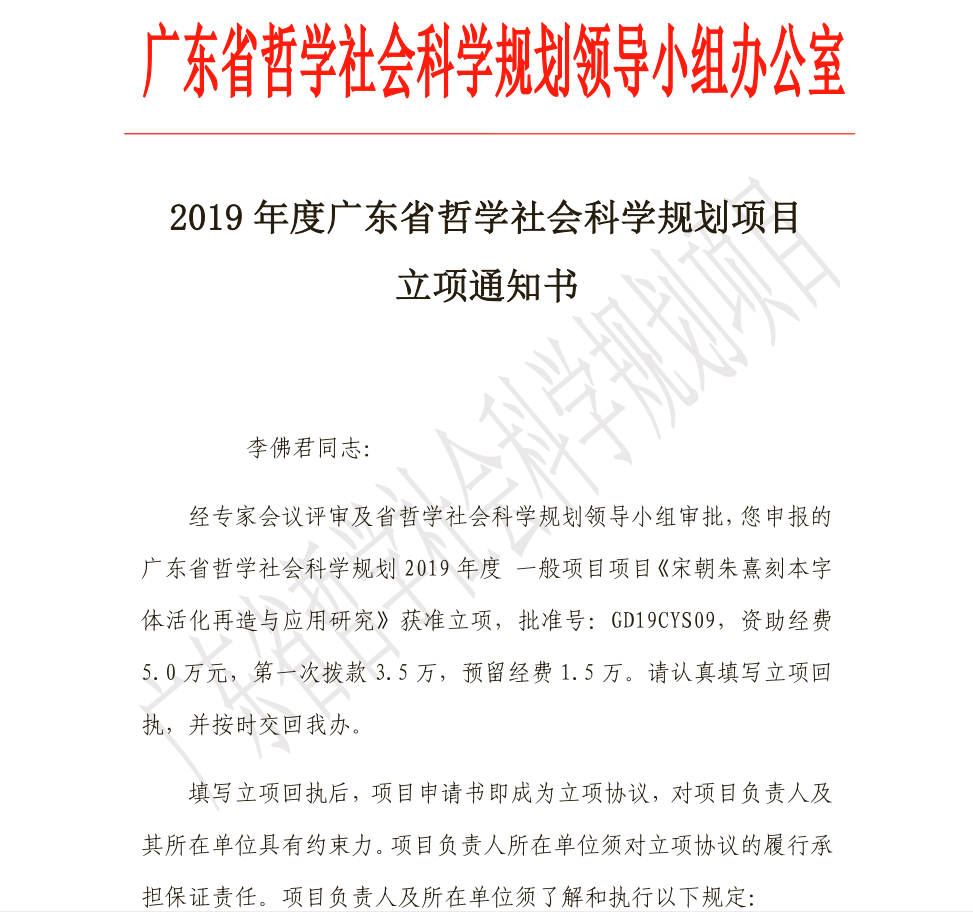 近日,從廣東省哲學(xué)社會(huì)科學(xué)規(guī)劃領(lǐng)導(dǎo)小組辦公室傳來(lái)喜訊:我校藝術(shù)與設(shè)計(jì)學(xué)院李佛君老師研究項(xiàng)目《宋朝朱熹刻本字體活化再造與應(yīng)用研究》獲準(zhǔn)立項(xiàng),這是我校第二個(gè)省哲社科一般項(xiàng)目、藝術(shù)與設(shè)計(jì)學(xué)院的首個(gè)此類項(xiàng)目。