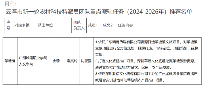 近日,云浮市科技局公示了《廣東省科學(xué)技術(shù)廳關(guān)于落實“百千萬工程”開展新一輪農(nóng)村科技特派員重點派駐任務(wù)(2024-2026年)》項目推薦名單,我校人文學(xué)院余蓉副教授團隊與云浮市羅定市蘋塘鎮(zhèn)對接的幫扶項目成功獲批。