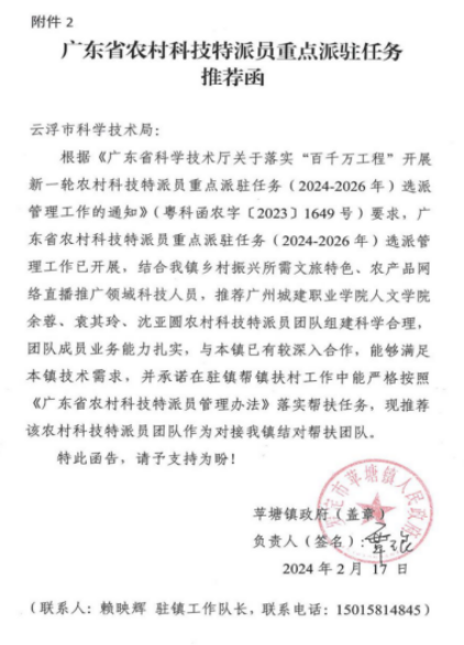 經(jīng)過多次調(diào)研走訪,項目團隊與蘋塘鎮(zhèn)政府在幫扶項目任務(wù)上達成了共識,明確了科技特派員的主要派駐任務(wù),蘋塘鎮(zhèn)政府于2024年2月17日向云浮市科技局提交了新一輪農(nóng)村科技特派員重點派駐任務(wù)“推薦函”。