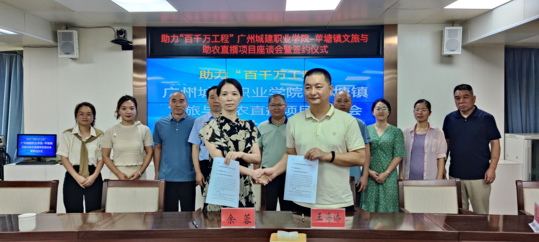 座談會(huì)后,雙方舉行了簽約儀式,魯巖、余蓉分別與駐鎮(zhèn)工作隊(duì)隊(duì)長(zhǎng)王海僑簽訂了《蘋(píng)塘鎮(zhèn)鄉(xiāng)村振興人才驛站進(jìn)駐協(xié)議書(shū)》和《廣東省農(nóng)村科技特派員幫扶工作協(xié)議書(shū)》。