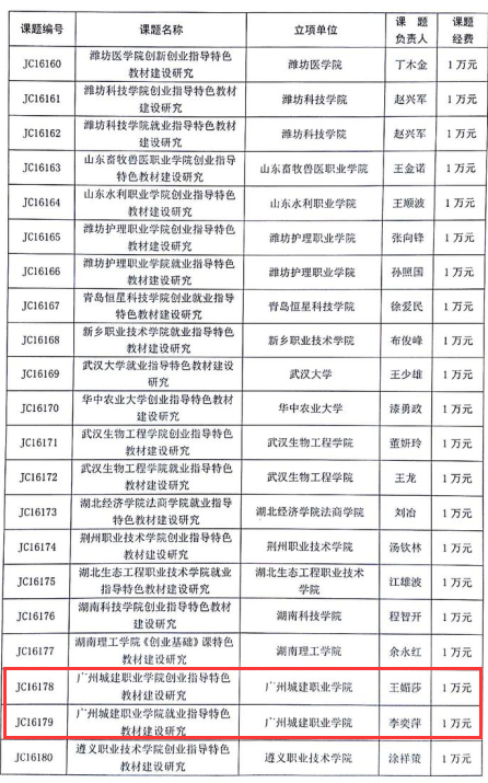 根據(jù)全國高等學校學生信息咨詢與就業(yè)指導(dǎo)中心印發(fā)的《關(guān)于開展2016年全國高校就業(yè)創(chuàng)業(yè)指導(dǎo)課程特色教材課題研究工作的通知》(教畢指〔2016〕18號)文件獲悉,經(jīng)全國高等學校學生信息咨詢與就業(yè)指導(dǎo)中心專家小組評審?fù)ㄟ^,我校王媚莎老師申報的“廣州城建職業(yè)學院創(chuàng)業(yè)指導(dǎo)特色教材建設(shè)研究”和李奕萍老師申報的“廣州城建職業(yè)學院就業(yè)指導(dǎo)特色教材建設(shè)研究”兩課題獲批立項。