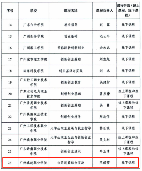 4月1日,廣東省教育廳發(fā)布了《關(guān)于2021年廣東省高校就業(yè)創(chuàng)業(yè)金課名單的通知》(粵教畢函〔2021〕3號(hào)),經(jīng)高校推薦,專家評(píng)審等程序,最終遴選出26門課程作為2021年廣東省高校就業(yè)創(chuàng)業(yè)金課,我校推選《公司運(yùn)營(yíng)綜合實(shí)戰(zhàn)》成功入選省級(jí)創(chuàng)新創(chuàng)業(yè)金課,為我校第一門省級(jí)金課。本次本科院校入選18門,公辦高職6門,民辦高職2門。