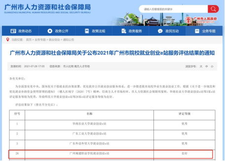 近日,廣州市人力資源和社會保障局公布了2021年廣州市院校就業(yè)創(chuàng)業(yè)e站服務(wù)評估結(jié)果,我校順利通過評估,被評定為“良好”等級。