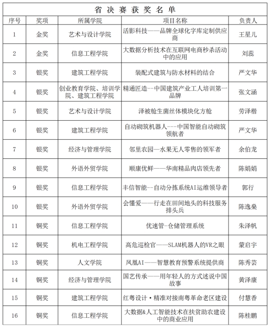 近日,廣東省教育廳下發(fā)了《廣東省教育廳關(guān)于公布第七屆中國國際“互聯(lián)網(wǎng)+”大學生創(chuàng)新創(chuàng)業(yè)大賽廣東省分賽獲獎名單的通知》和《廣東省教育廳關(guān)于公布第七屆中國國際“互聯(lián)網(wǎng)+”大學生創(chuàng)新創(chuàng)業(yè)大賽廣東省分賽產(chǎn)業(yè)賽道獲獎名單的通知》文件,“活影科技——品牌全球化字庫定制供應商”、“精通匠造--中國建筑產(chǎn)業(yè)工人培訓第一品牌”、“大數(shù)據(jù)分析技術(shù)在互聯(lián)網(wǎng)電商秒殺活動中的應用”、“鄰里農(nóng)園——水果無人零售的領(lǐng)軍者”四個項目晉級國賽,其中”活影科技“、”精通匠造“晉級全國現(xiàn)場總決賽。我校學子在廣東省分賽中獲得2金8銀6銅的好成績,獎牌總數(shù)位列全省高職院校第三、全省民辦院校第一;金牌數(shù)位列全省高職院校第五、全省民辦院校第一,再次取得新的突破。同時,我校獲得職教賽道優(yōu)秀組織獎、“青年紅色筑夢之旅”優(yōu)秀組織高校獎。