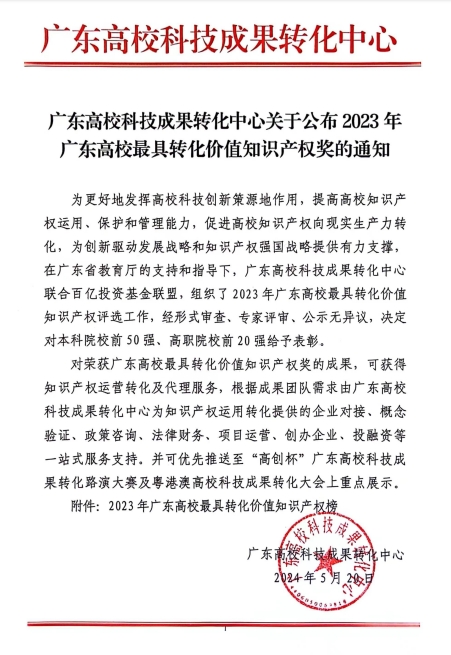 近日,廣東高??萍汲晒D(zhuǎn)化中心公布了2023年廣東高校最具轉(zhuǎn)化價值知識產(chǎn)權(quán)獎的評審結(jié)果,我校一項專利獲得最具轉(zhuǎn)化價值知識產(chǎn)權(quán)獎。
