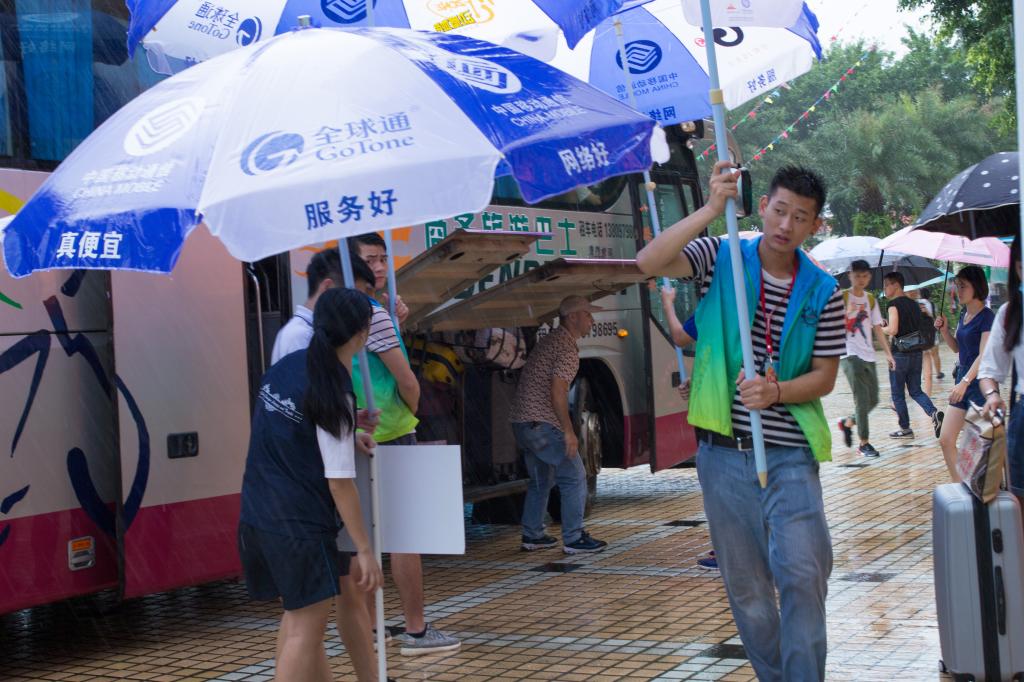 突如其來(lái)的陣雨停下了家長(zhǎng)和學(xué)生們的腳步,他們只好躲在建筑物下避雨。此時(shí),身穿彩色透明雨衣的志愿者們出現(xiàn)了,他們拿著帳篷大小的傘快步走向人群,“嘩”地一聲把傘打開(kāi),說(shuō):“快進(jìn)來(lái),我們送你們過(guò)去,行李在哪?我們提就好!”家長(zhǎng)們不禁連聲道謝,隨同志愿者們漸行漸遠(yuǎn)。