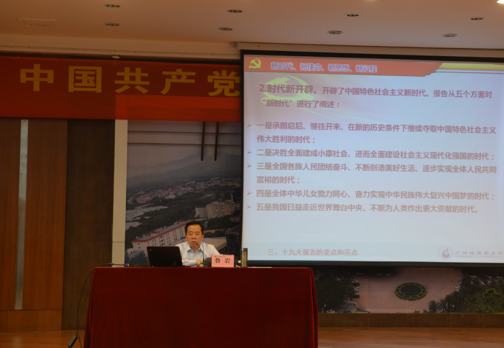 11月2日下午,我校在人文藝術(shù)樓四樓報告廳舉行了學習黨的十九大精神專題輔導報告會,黨委副書記魯巖作了題為“新時代、新使命、新思想、新征程”的報告。校長劉國生,督導專員莫火材,全體校領(lǐng)導及師生黨員聆聽了報告。報告會由黨委書記楊清國主持。