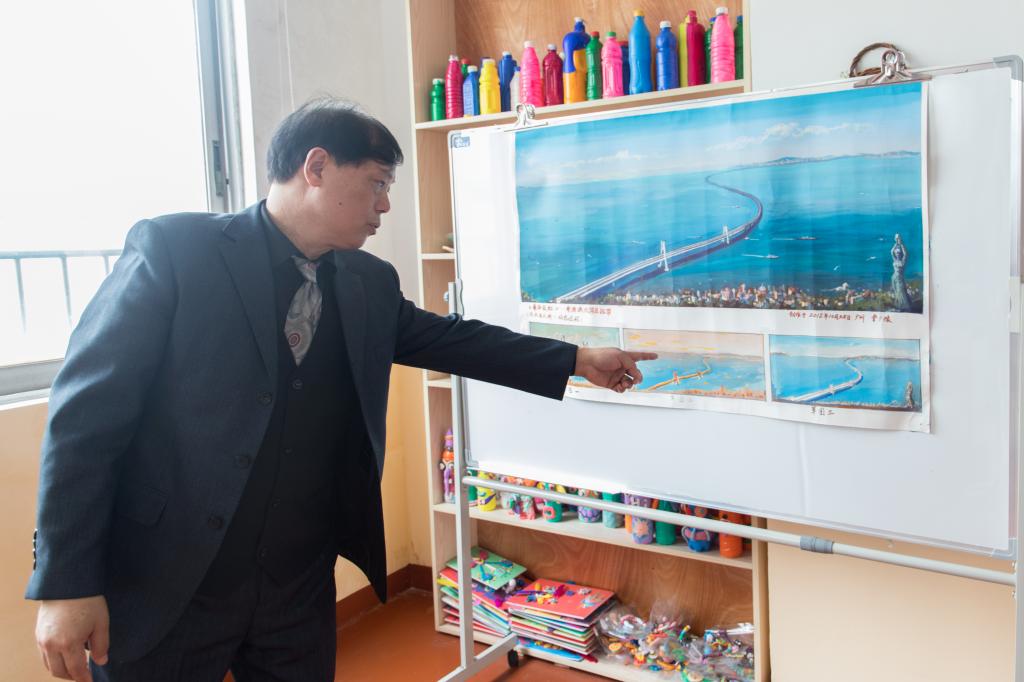 《南海長虹——港珠澳大橋》是曹廣豫副教授在港珠澳大橋建成之時,心潮澎湃,將自己滿腔赤子情懷融于畫筆之下,耗時二月余繪制而成。在與曹副教授的采訪交談過程中,他告訴我們,總書記親民愛民,更是親臨港珠澳大橋的開通儀式,讓他感動不已。他希望能用自己的綿薄之力為時代謳歌立傳,所以《南海長虹——港珠澳大橋》描繪的是一座圓夢橋、同心橋、自信橋、復(fù)興橋,抒發(fā)的是一份喜悅情、感恩情、自豪情、愛國情。