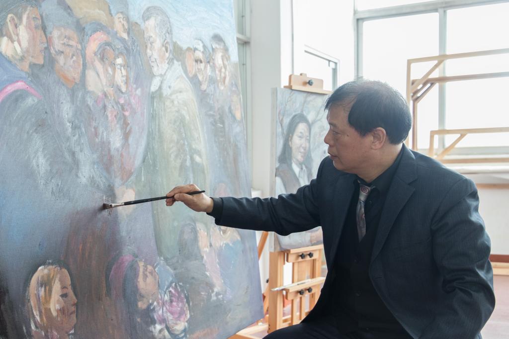 此次當(dāng)我們訪問之時,曹廣豫副教授正在創(chuàng)作新作品《習(xí)近平總書記與人民心連心》,盡管作品尚未完成,但從已經(jīng)逐漸明朗的作品輪廓和主題上來看,曹教授依然喜好并且擅長于以情繪畫,借畫言赤子情。