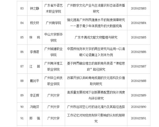 近日,廣州市哲學(xué)社會(huì)科學(xué)規(guī)劃2020年度資助經(jīng)費(fèi)課題立項(xiàng)187項(xiàng)。其中,重大課題9項(xiàng),智庫(kù)課題5項(xiàng),嶺南文化專項(xiàng)課題2項(xiàng),廣州大典專項(xiàng)課題8項(xiàng),廣州大典博士論文資助3項(xiàng),一般課題98項(xiàng),羊城青年學(xué)人課題62項(xiàng)。
