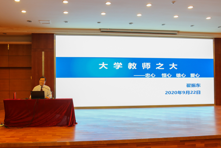 講座上,翟振東教授圍繞“四心”,對(duì)大學(xué)教師應(yīng)具備的思想政治素質(zhì)和職業(yè)道德水平進(jìn)行了闡述。他說(shuō),大學(xué)教師之大,大在獻(xiàn)身教育的忠心、大在傾心教學(xué)的恒心、大在潛心教研的雄心、大在育人成才的愛(ài)心。他認(rèn)為,要建設(shè)一支師德高尚、業(yè)務(wù)精湛、結(jié)構(gòu)合理、充滿活力的高素質(zhì)專業(yè)化創(chuàng)新型教師隊(duì)伍,教師要做到以德立身、以德立教、以德立學(xué);要掌握“五個(gè)一”:一口普通話、一筆好板書(shū)、一副好口才、一套好課件、一手好文章;要把教學(xué)工作當(dāng)作教研(科研)工作,以教研(科研)促進(jìn)教學(xué),使教學(xué)與研究雙提升、雙增長(zhǎng);教育的根本任務(wù)就是立德樹(shù)人,要具有一顆仁愛(ài)之心。