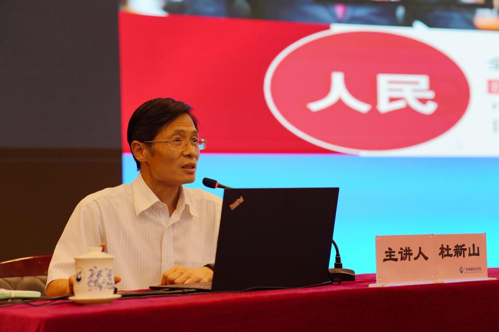 杜新山以“學(xué)思踐悟《習(xí)近平談治國理政》第三卷”為題,分別從“為什么學(xué)”、“怎么學(xué)”、“把《習(xí)近平談治國理政》第三卷精神宣傳好貫徹好”三個方面進行了詳細講解。提出了學(xué)立場、學(xué)視野、學(xué)文風(fēng)、學(xué)方法、學(xué)作風(fēng)“五個學(xué)”和一二三卷一體學(xué)習(xí)體會、理論實踐一體學(xué)習(xí)體會、主題專題一體學(xué)習(xí)體會“三個一體學(xué)習(xí)體會”的要求。