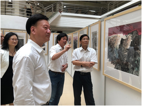 在參觀書畫藝術(shù)作品展時,藝術(shù)與設(shè)計學(xué)院院長劉境奇介紹說,為了迎接中國共產(chǎn)黨建黨100周年,他正在籌備、創(chuàng)作100幅以井岡山紅色文化為主題的作品,準(zhǔn)備明年辦一個展覽。杜新山聽后大加贊賞。