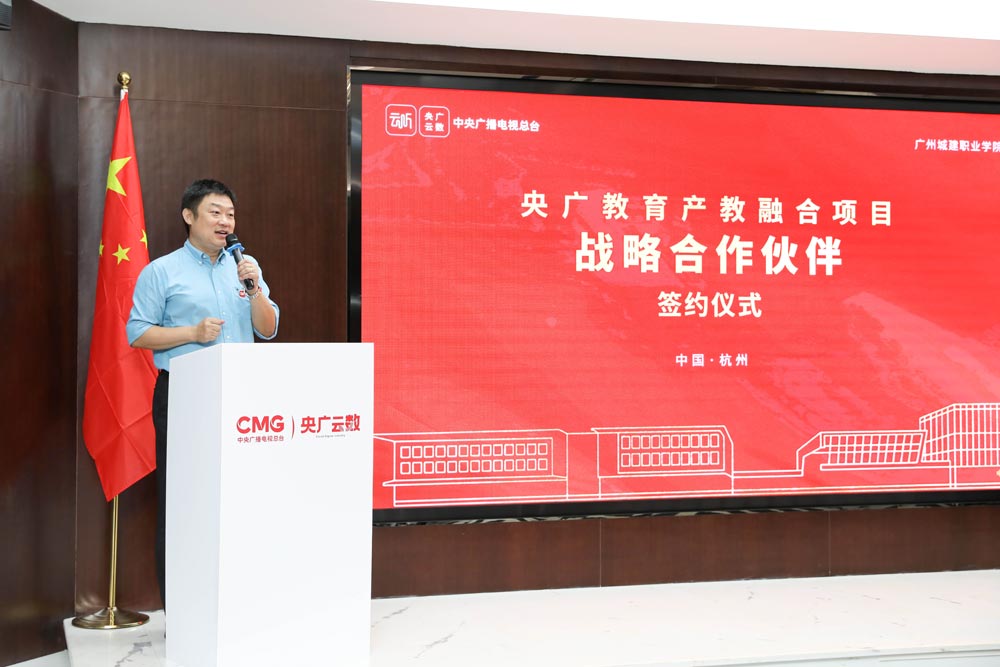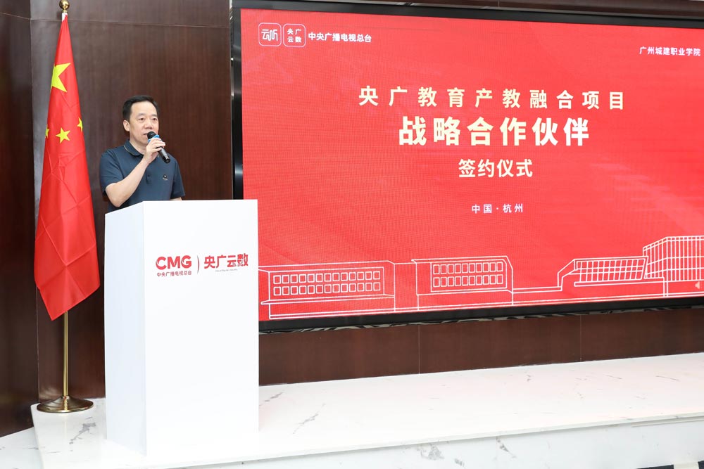 張東在致辭中首先對(duì)廣州城建職業(yè)學(xué)院相關(guān)領(lǐng)導(dǎo)一行的到來(lái)表示熱烈歡迎。他說(shuō),經(jīng)過(guò)前期充分的溝通交流,雙方在探索互聯(lián)網(wǎng)、新媒體和產(chǎn)學(xué)研行業(yè)發(fā)展的原則和宗旨上已達(dá)成高度共識(shí),未來(lái),央廣云數(shù)將與廣州城建職業(yè)學(xué)院共進(jìn)共利、共創(chuàng)輝煌。他希望雙方以創(chuàng)新精神開拓職業(yè)教育之路,共建以產(chǎn)業(yè)需求為導(dǎo)向的產(chǎn)業(yè)學(xué)院,帶頭做改革創(chuàng)新的“排頭兵”,在中央廣播電視總臺(tái)全媒體資源的優(yōu)勢(shì)配合下,在權(quán)威品牌的大力支撐下,打造出具有鮮明特色的產(chǎn)教融合教育體系。