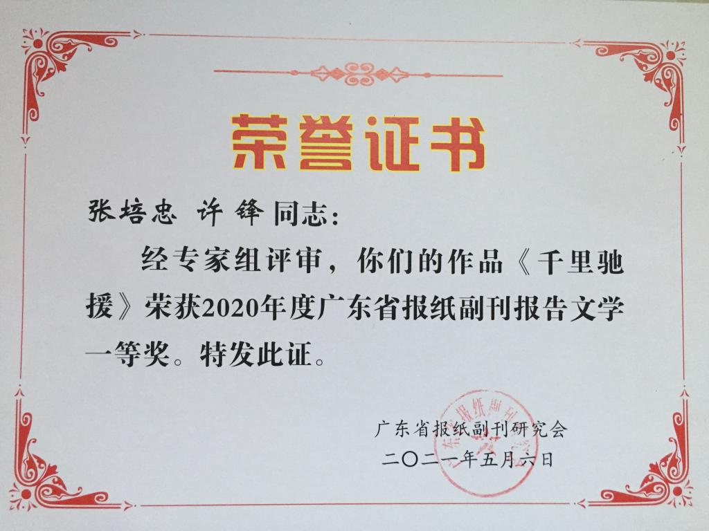 5月6日,2020年度廣東省報紙副刊作品評選揭曉,我校校辦副主任兼黨委宣傳部部長、國家一級作家許鋒的《千里馳援》(合)榮獲報告文學(xué)類一等獎。