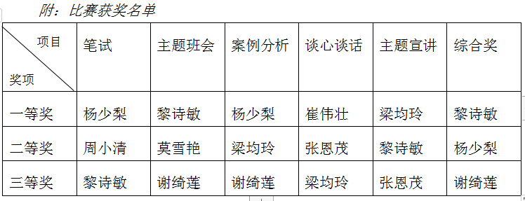 經(jīng)過激烈比拼,人文學院黎詩敏獲得大賽一等獎及主題班會環(huán)節(jié)一等獎,建筑工程學院楊少梨、外語外貿(mào)學院崔偉壯、信息工程學院梁均玲分別獲得案例分析環(huán)節(jié)、談心談話環(huán)節(jié)、主題宣講環(huán)節(jié)一等獎。(獲獎名單附后)