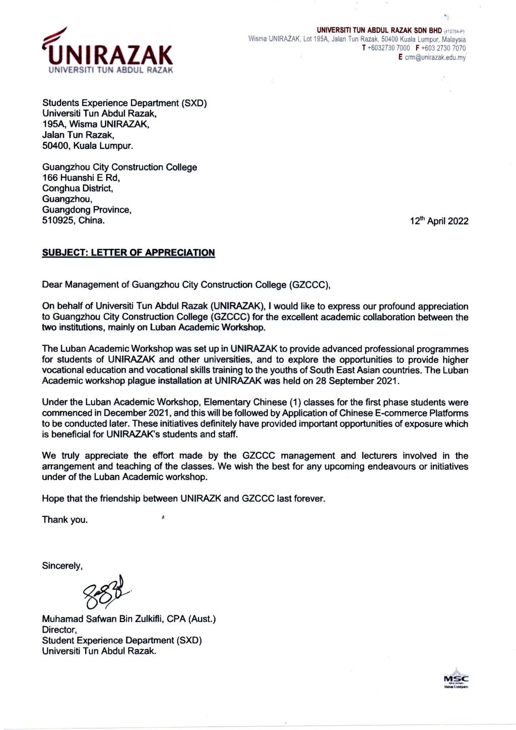 4月13日,我校收到來自馬來西亞敦阿都拉薩大學的感謝信和錦旗。在信中,敦阿都拉薩大學學生體驗部主任Mr. Safwan Zulkifli代表學校感謝我校在疫情期間,克服種種困難設立“魯班工坊”,開設線上《初級漢語》等課程,讓敦阿都拉薩的師生和其他大學的學生們有機會學習中文和先進的職業(yè)技術(shù)課程,體驗中國的傳統(tǒng)文化。