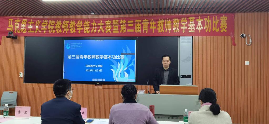 為切實(shí)加強(qiáng)思想政治理論課建設(shè),提高思想政治理論課教學(xué)水平和人才培養(yǎng)質(zhì)量,努力打造思想政治理論課“金課”,全面提高思政課教師隊(duì)伍素質(zhì)能力,12月3日,馬克思主義學(xué)院在人文藝術(shù)樓204室舉行教學(xué)能力大賽暨青年教師教學(xué)基本功比賽。學(xué)校黨委副書記魯巖,馬克思主義學(xué)院院長譚德禮、黨支部書記王鮮及馬院全體教師現(xiàn)場參加觀摩比賽。本次活動(dòng)特別邀請(qǐng)了廣州番禺職業(yè)技術(shù)學(xué)院馬克思主義學(xué)院院長曹群教授、順德職業(yè)技術(shù)學(xué)院馬克思主義學(xué)院原院長、黨總支書記李霞教授擔(dān)任線上評(píng)委,廣東機(jī)電職業(yè)技術(shù)學(xué)院馬克思主義學(xué)院院長楊定明教授、學(xué)校人文學(xué)院王玉芳教授以及馬院易剛明博士、劉欣老師擔(dān)任現(xiàn)場評(píng)委。
