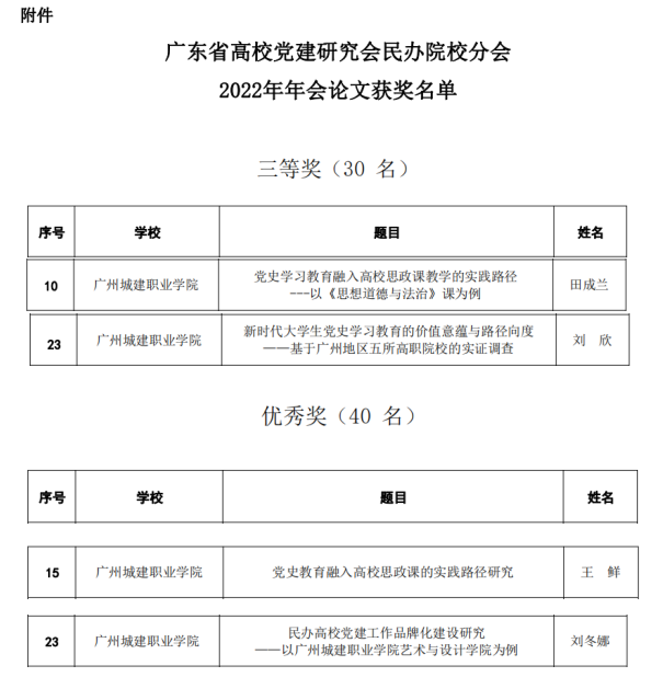 同日,廣東省高等學校黨的建設研究會民辦學校分會公布了2022年年會論文征集評選活動獲獎名單,由我校推薦的論文獲得三等獎2項、優(yōu)秀獎2項。