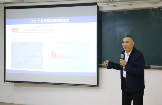 緊接著,他帶領同學們回顧了習近平總書記三次廣東考察以及兩次參加兩會廣東代表團審議時的重要講話和重要指示批示精神,總結(jié)了廣東近年來改革發(fā)展所取得的巨大成效,介紹了今年初廣東高質(zhì)量發(fā)展大會提出的新任務和新目標。大量詳實的數(shù)據(jù),生動鮮明的對比,流暢動感的視頻,讓同學們精神振奮,無不為廣東的發(fā)展成就所震撼,也更加堅定了同學們對廣東進一步推進高質(zhì)量發(fā)展,再造一個新廣東的信心和決心。