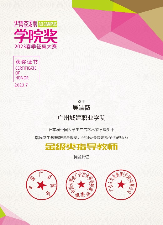 近日,“中國大學生廣告藝術節(jié)學院獎”大賽頒獎典禮在北京舉行,揭曉了學院獎2023春季征集大賽的評比結果。由我校人文學院吳潔薇老師指導,網絡新聞與傳播專業(yè)張詠妍、鐘墁琪、李瑩平、覃思宇、陳希藍、巫迪等六位同學創(chuàng)作的短視頻作品《生﹒活》斬獲由魯南制藥-啟達力冠名命題的視頻類賽道唯一全國金獎,也是本賽道獲獎的唯一??圃盒!菨嵽崩蠋煫@“金級類指導教師”榮譽稱號。