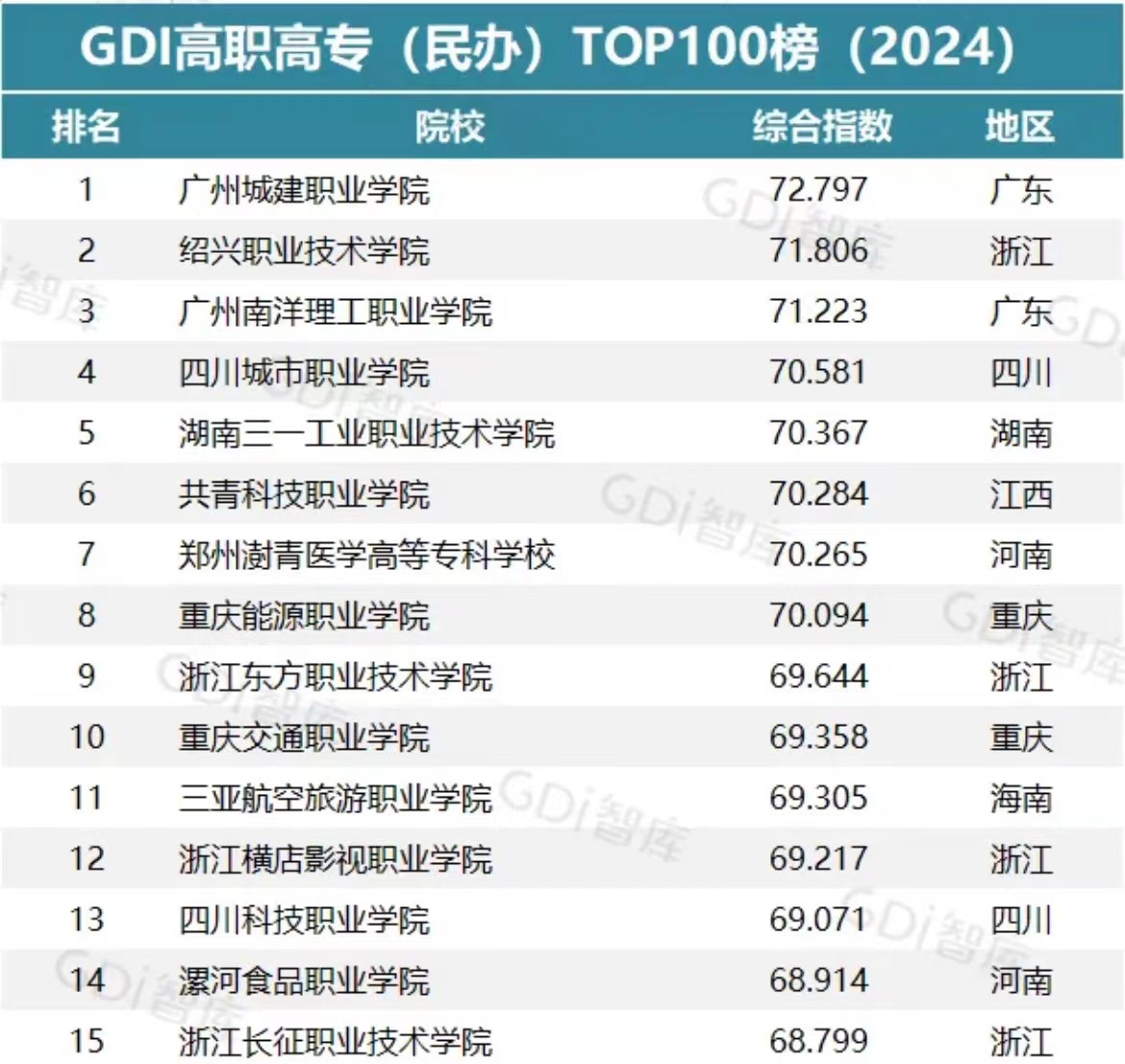 3月19日,廣州日報數(shù)據(jù)和GDI智庫發(fā)布“GDI高職高專排行榜(2024)”,榜單對全國1545所高職院校(不含香港、澳門和臺灣地區(qū)院校)進行科學評價,我校位列全國252位(較2023年上升49個位次)、民辦第1位,在廣東省高職高專排名第21位。