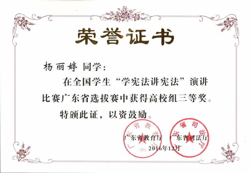 日前,從廣東省教育廳主辦,廣東省司法廳承辦的全國(guó)學(xué)生“學(xué)憲法講憲法”演講比賽廣東省選拔賽獲獎(jiǎng)名單獲悉,我校學(xué)生楊麗婷獲高校組三等獎(jiǎng)。