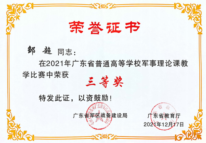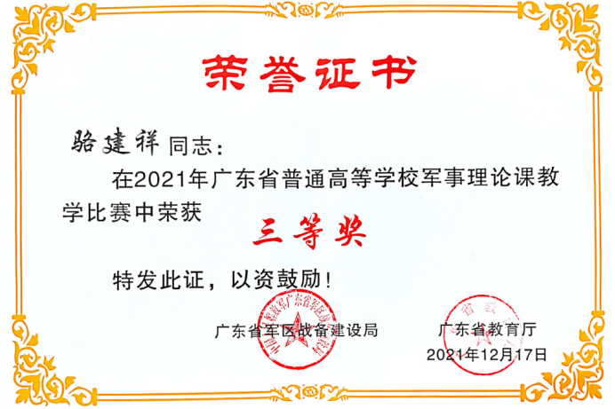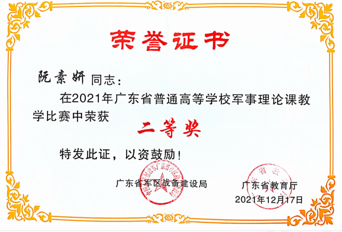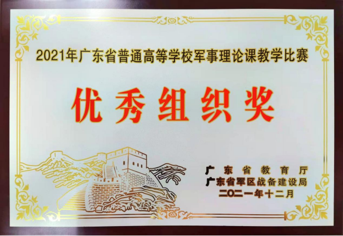 近日,由廣東省教育廳、廣東省軍區(qū)戰(zhàn)備建設(shè)局主辦,廣東省國防教育學(xué)會(huì)承辦的“2021年廣東省普通高等學(xué)校軍事理論課教學(xué)比賽”公布結(jié)果,我校輔導(dǎo)員阮素妍老師榮獲二等獎(jiǎng),鄒超、駱建祥老師榮獲三等獎(jiǎng),學(xué)校榮獲優(yōu)秀組織獎(jiǎng)。