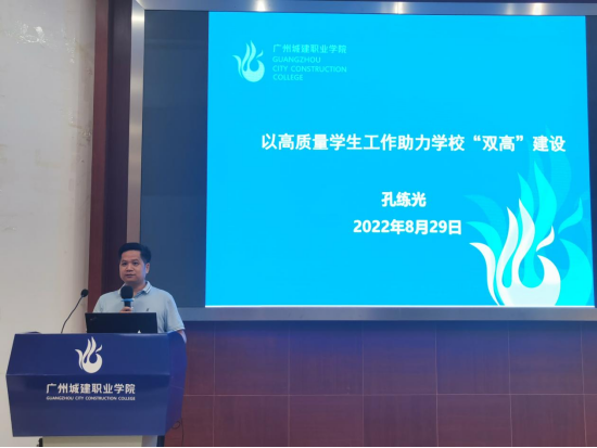 孔練光作題為《以高質(zhì)量學(xué)生工作助力學(xué)?!半p高”建設(shè)》的報告,在上半年,學(xué)生工作成績喜人,亮點紛呈,多項成果取得突破,如第十三屆“挑戰(zhàn)杯”廣東大學(xué)生創(chuàng)業(yè)計劃競賽獲3金5銀7銅,金牌獲獎數(shù)位居全省高職院校第二;2022年全國大中專學(xué)生志愿者暑期文化科技衛(wèi)生“三下鄉(xiāng)”社會實踐活動全國重點團隊2支、全省重點團隊12支,立項位居全省同類院校第一;入選教育部“一站式”學(xué)生社區(qū)綜合管理模式建設(shè)自主試點單位等;此外,在廣東省輔導(dǎo)員素質(zhì)能力大賽、廣東省普通高等學(xué)校軍事理論課教學(xué)比賽、廣東高校思想政治工作優(yōu)秀論文征集評選等活動中也取得優(yōu)異成績。針對新學(xué)期各項工作,他指出全體學(xué)工隊伍要以“雙高校”建設(shè)為契機,履職盡責(zé),主動作為,全面提升學(xué)生工作質(zhì)量,為“雙高校”建設(shè)貢獻智慧和力量,并提出幾點要求:一是要守紀(jì)律。輔導(dǎo)員老師要堅定政治信仰,守住師德師風(fēng)、規(guī)章制度和紀(jì)律法律的底線,努力建設(shè)良好育人環(huán)境;二是要強學(xué)習(xí)。加強政治理論學(xué)習(xí),提升業(yè)務(wù)知識儲備,掌握好學(xué)生成長規(guī)律,以科學(xué)理論指導(dǎo)工作。三是要重實效。堅持問題導(dǎo)向,在推進工作中抓重點,確保工作有成果。四是要保穩(wěn)定。高度重視安全穩(wěn)定工作,切實為學(xué)生健康成長提供堅強保障。