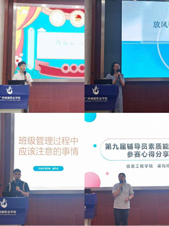 建筑工程學(xué)院學(xué)工副院長張雙以《當(dāng)好排頭兵畫好同心圓”》為主題,圍繞學(xué)院學(xué)生工作基本情況、特色亮點、經(jīng)驗做法等方面進行分享。人文學(xué)院輔導(dǎo)員李垚森以《共青春共成長》為主題分享了團學(xué)工作經(jīng)驗,經(jīng)濟與管理院學(xué)院輔導(dǎo)員衛(wèi)鳳瓊、外語外貿(mào)學(xué)院輔導(dǎo)員崔偉壯分別以《放風(fēng)箏的人》、《班級管理要點》為主題分享了班級管理經(jīng)驗,信息工程學(xué)院輔導(dǎo)員梁均玲以《輔導(dǎo)員素質(zhì)大賽》為主題作參賽心得分享。