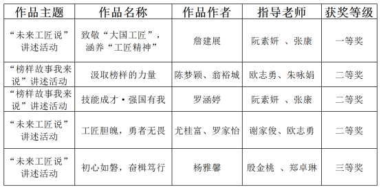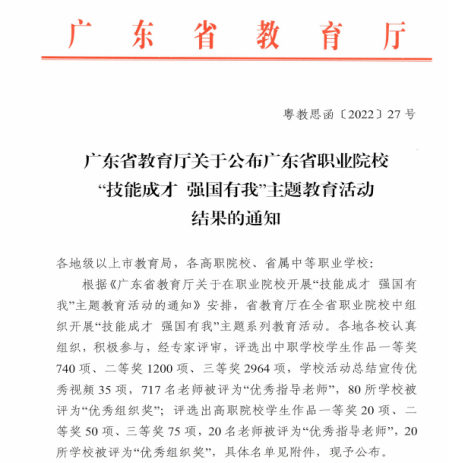 近日,廣東省教育廳公布了《廣東省職業(yè)院校“技能成才 強(qiáng)國(guó)有我”主題教育活動(dòng)結(jié)果的通知》,我校推薦的5項(xiàng)參賽作品分別榮獲一等獎(jiǎng)1項(xiàng)、二等獎(jiǎng)3項(xiàng)、三等獎(jiǎng)1項(xiàng),阮素妍老師獲評(píng)“優(yōu)秀指導(dǎo)老師”,學(xué)校獲評(píng)“優(yōu)秀組織獎(jiǎng)”。