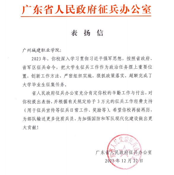 近日,我校收到廣東省人民政府征兵辦公室表揚信,對我校2023年征兵工作予以表揚。
