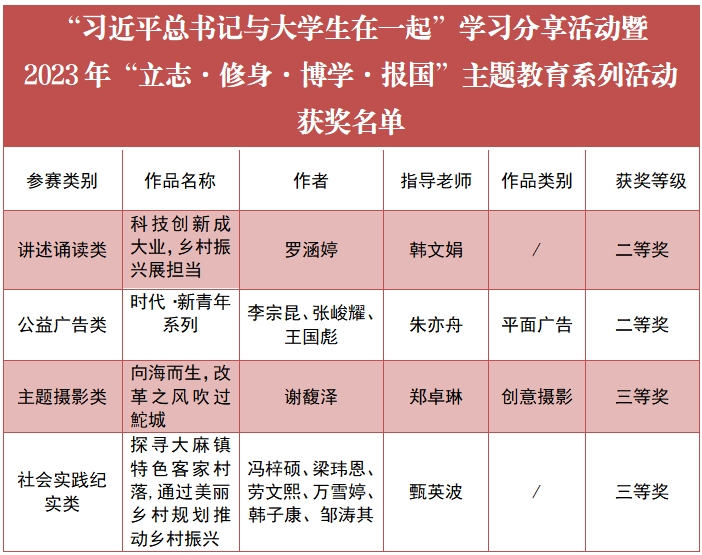 1月12日,廣東省教育廳公布了“習(xí)近平總書記與大學(xué)生在一起”學(xué)習(xí)分享活動暨2023年“立志·修身·博學(xué)·報國”主題教育系列活動評選結(jié)果,我校師生團隊參賽作品在講述誦讀類、公益廣告類、主題攝影類和社會實踐紀(jì)實類項目中榮獲二等獎兩項、三等獎兩項,獲獎數(shù)量、質(zhì)量居同類院校前列。