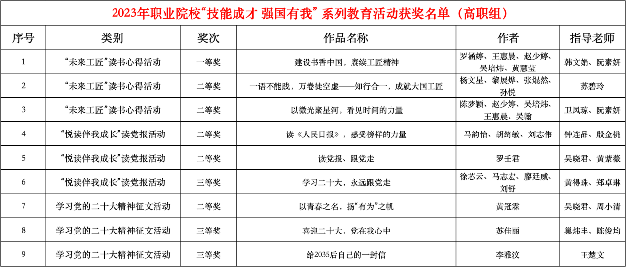 近日,廣東省教育廳印發(fā)了《關(guān)于公布2023年職業(yè)院?!凹寄艹刹?強(qiáng)國有我”系列教育活動結(jié)果的通知》,我校師生參賽作品榮獲一等獎1項(xiàng)、二等獎5項(xiàng)、三等獎3項(xiàng),韓文娟老師獲評“優(yōu)秀指導(dǎo)老師”,學(xué)校獲評“優(yōu)秀組織獎”。